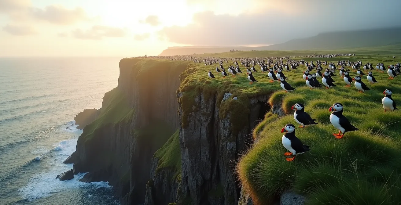 Face aux falaises vertigineuses de Látrabjarg ou de Dyrhólaey, le spectacle est saisissant. Des milliers de macareux moines, avec leur bec coloré et leur allure gauche, animent le paysage, devenant l’icône de la faune islandaise et l’objectif de tous les appareils photo. La plupart des guides de voyage s’arrêtent là, listant les meilleurs spots d’observation et les périodes idéales pour apercevoir la colonie. C’est une vision séduisante, mais terriblement incomplète. Elle réduit ces créatures à de simples attractions, de belles images sur une carte postale vivante.