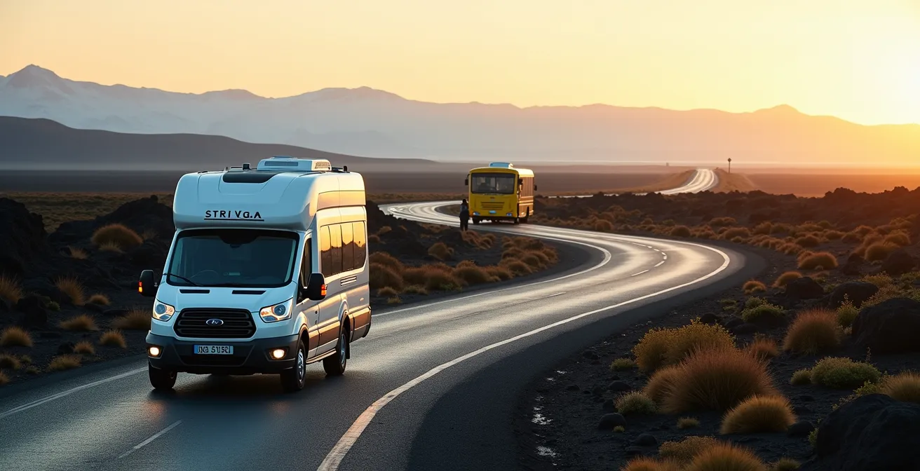 Choisir son mode de transport en Islande ressemble souvent à un casse-tête. D’un côté, l’image d’Épinal du 4×4 ou du van aménagé promet une liberté absolue face à des paysages spectaculaires. De l’autre, la réalité budgétaire impose de considérer le bus ou même l’autostop. Les guides traditionnels se contentent souvent de lister les avantages et inconvénients de chaque option, vous laissant seul face à une décision cruciale qui impactera l’intégralité de votre voyage, de votre portefeuille à vos souvenirs.